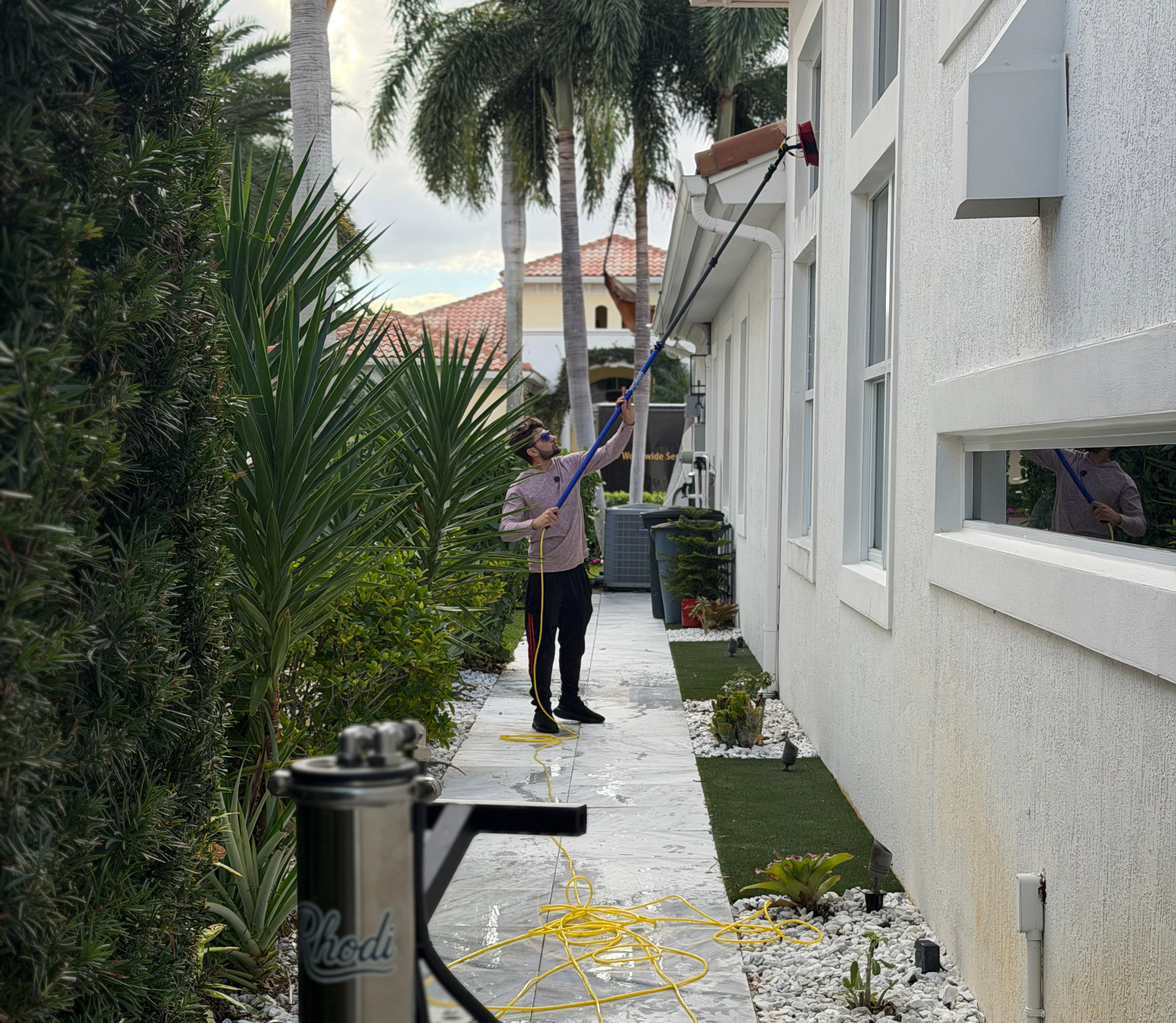 Water-fed pole cleaning uses purified water (0 TDS) pumped through a telescopic pole with a brush head. The pure water dissolves dirt and rinses windows without leaving any spots or streaks. No squeegeeing required. You clean from the ground, which is faster and safer than ladders.